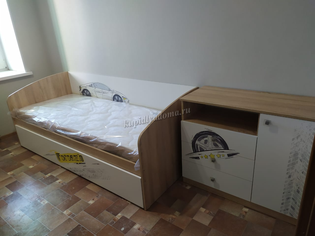 Дополнительное удобное спальное место или большой выдвижной ящик для хранения постельного белья и игрушек, на выбор, решать вам. Стильный принтерный рисунок на фасаде. Детская «Форсаж» - это стильная, современная детская, которая понравится каждому ребенку. Рисунок устойчив к истиранию и ультрафиолету.