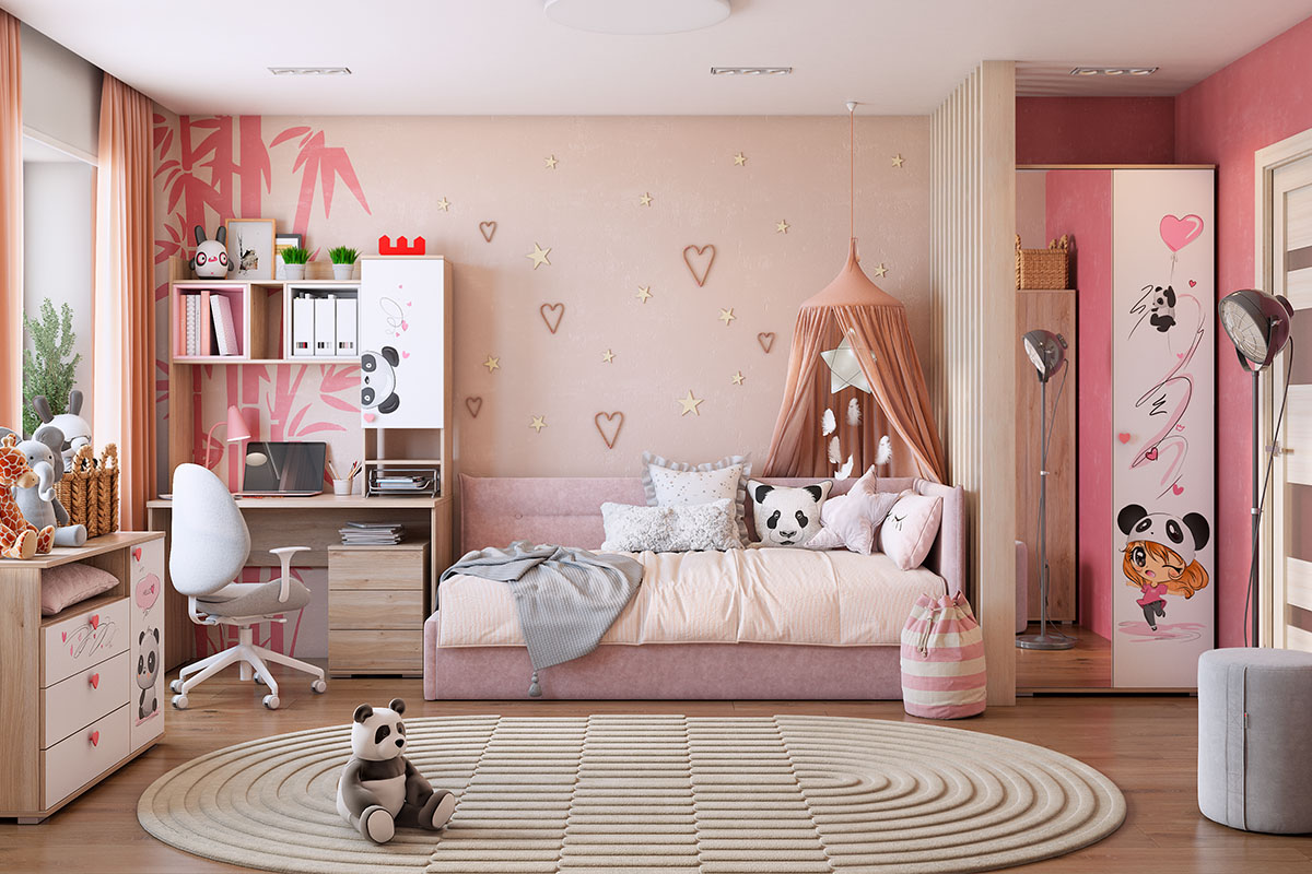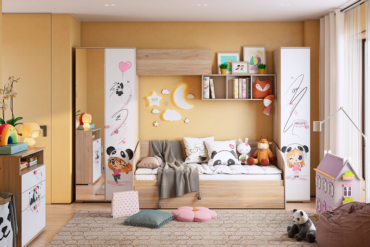 Модный и стильный рисунок на фасаде, придаст индивидуальность детской комнате, а тактильно приятные ручки-сердечки, очаруют каждую девочку. Принтерный рисунок устойчив к истиранию и ультрафиолету. Фасады комплектуются дополнительно "Доводчиком для петли 4-х шарнирной". Сборка внутреннего наполнения универсальная.
