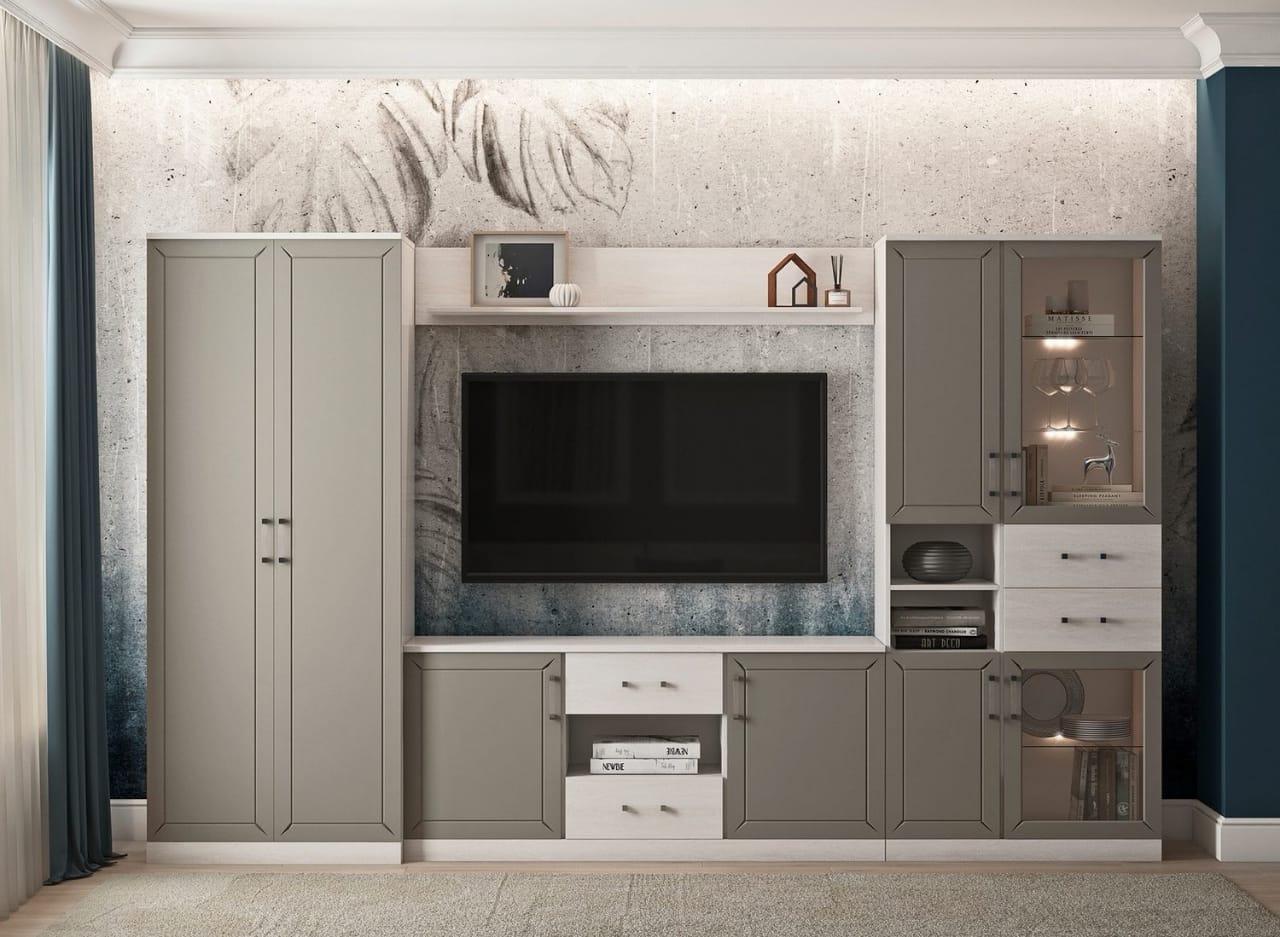 За счёт небольшого, но функционального набора модулей, ваша гостиная может насчитывать одну лишь тумбу под ТВ и полку, а может превратиться в полноценный гарнитур с пеналами разных видов и платяным шкафом.