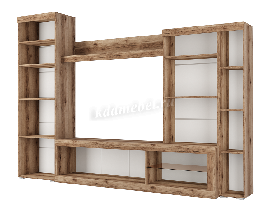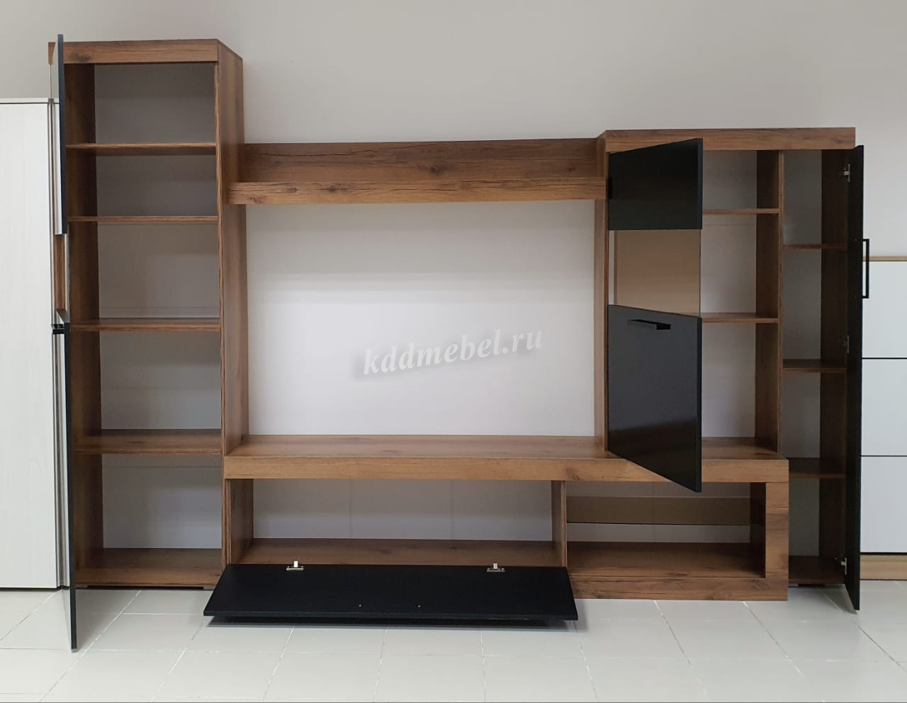 Состоит из шкафов с распашными дверями, тумбы для ТВ с выдвижным ящиком и открытыми нишами. В шкафах много вместительных полок.