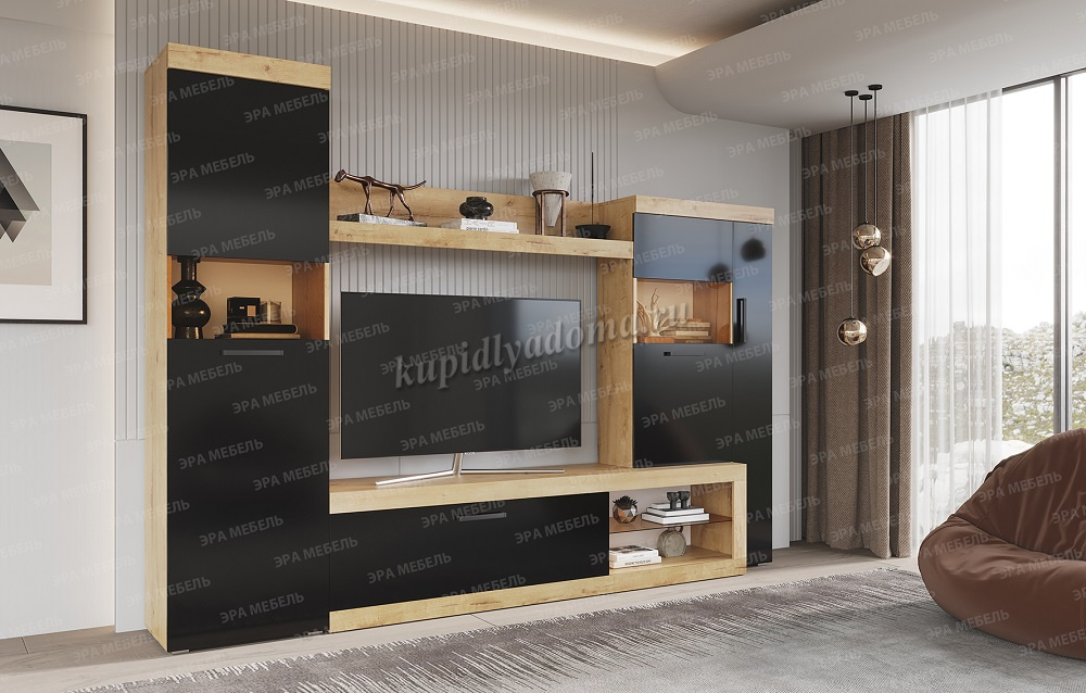 Описание Гостиная Бастон (Дуб вотан/Черный глянец)