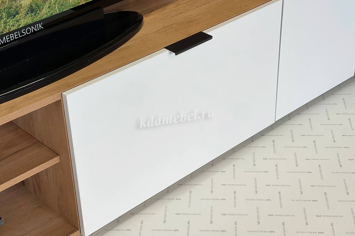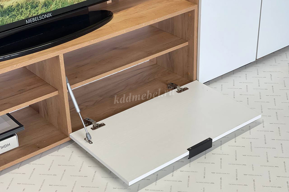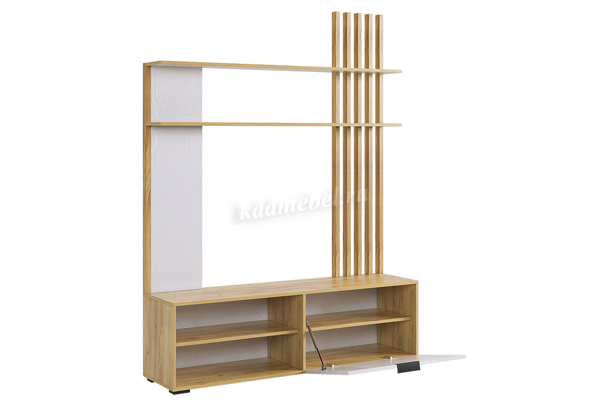 Состоит из: тумбы с открытыми и закрытыми секциями и полками над ТВ зоной.