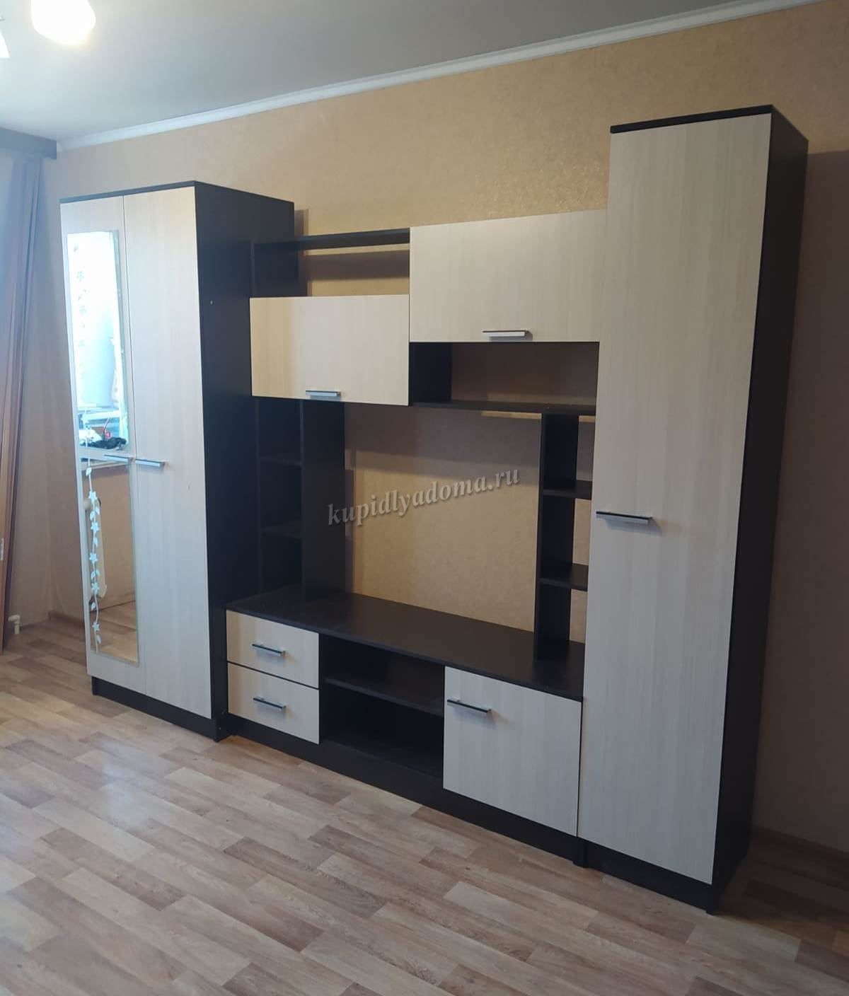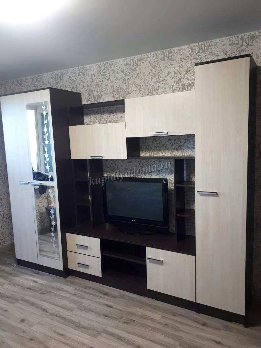 Стенка отпадная, вместительная и шкаф прям полноценный штанга вдоль шкафа, а не выдвигается, как в большинстве подобных стенок. Можно поменять местами шкаф и пенал, которые по бокам. В общем довольна как слон