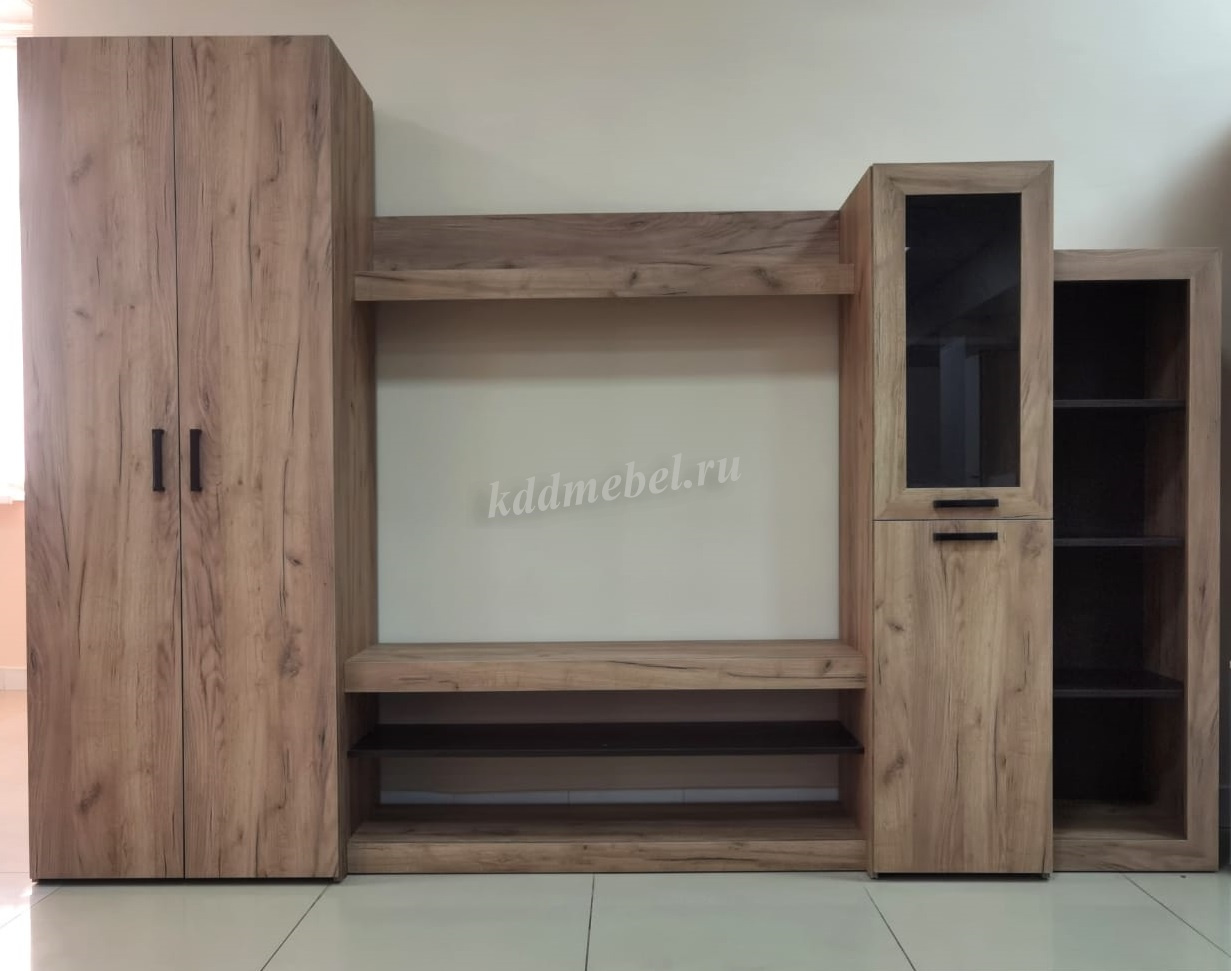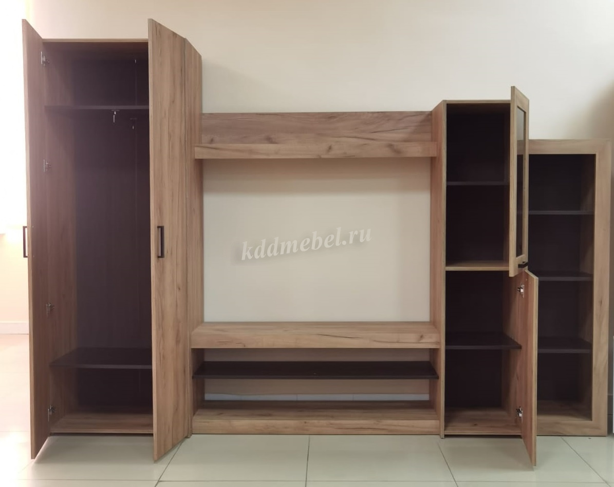 Вместительная стенка для небольших помещений. В гостиной «Oskar-4» предусмотрено: пенал, со стеклянной и глухой дверью, пристройка с открытыми полками, для хранения мелочей, бумаг, книг. Место для телевизора и аппаратуры. Полка для сувениров и фотографий. Плательный шкаф для хранения вещей на выдвижной штанге и на полках. За счет уменьшения высоты у пенала и пристройки, стенка имеет более облегченный вид.