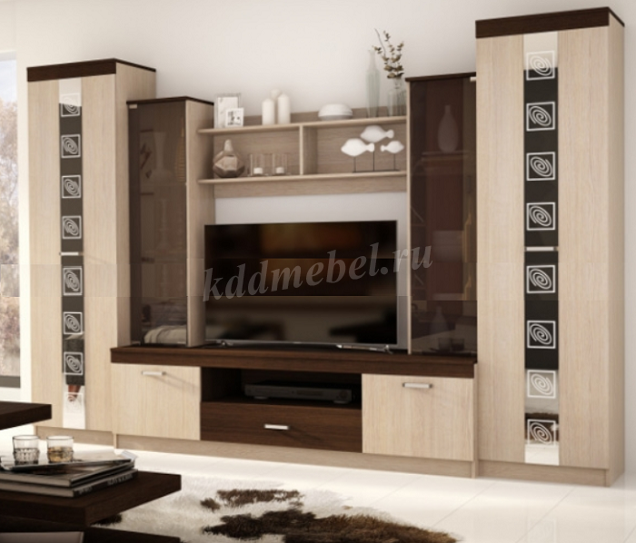 Оригинальная и рациональная стенка является воплощением современного стиля. Принадлежность к данному направлению умело подчеркнута минималистским декором и нежным сочетанием оттенков дуб сантана и дуб сонома. С такой стенкой ваша гостиная заиграет новыми красками, став более просторной, светлой и уютной
