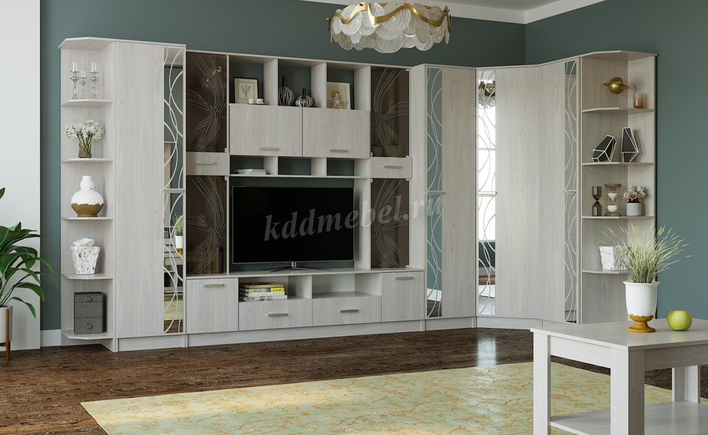 Модульная система для гостиной Сабина, включающая в себя 5 элементов, позволит обустроить зальную комнату в классическом стиле, сохраняя богатую функциональность.