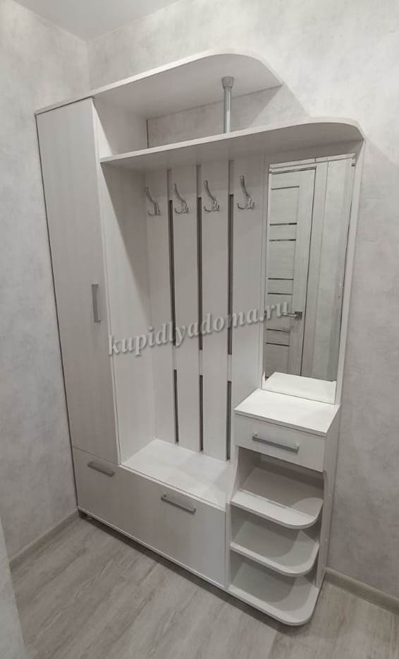 Состоит из: шкафа с полками, вешалки с крючками для одежды и сумок, обувницы, открытых полок, зеркала, полки для головных уборов, выдвижного ящика. Сборка универсальная.