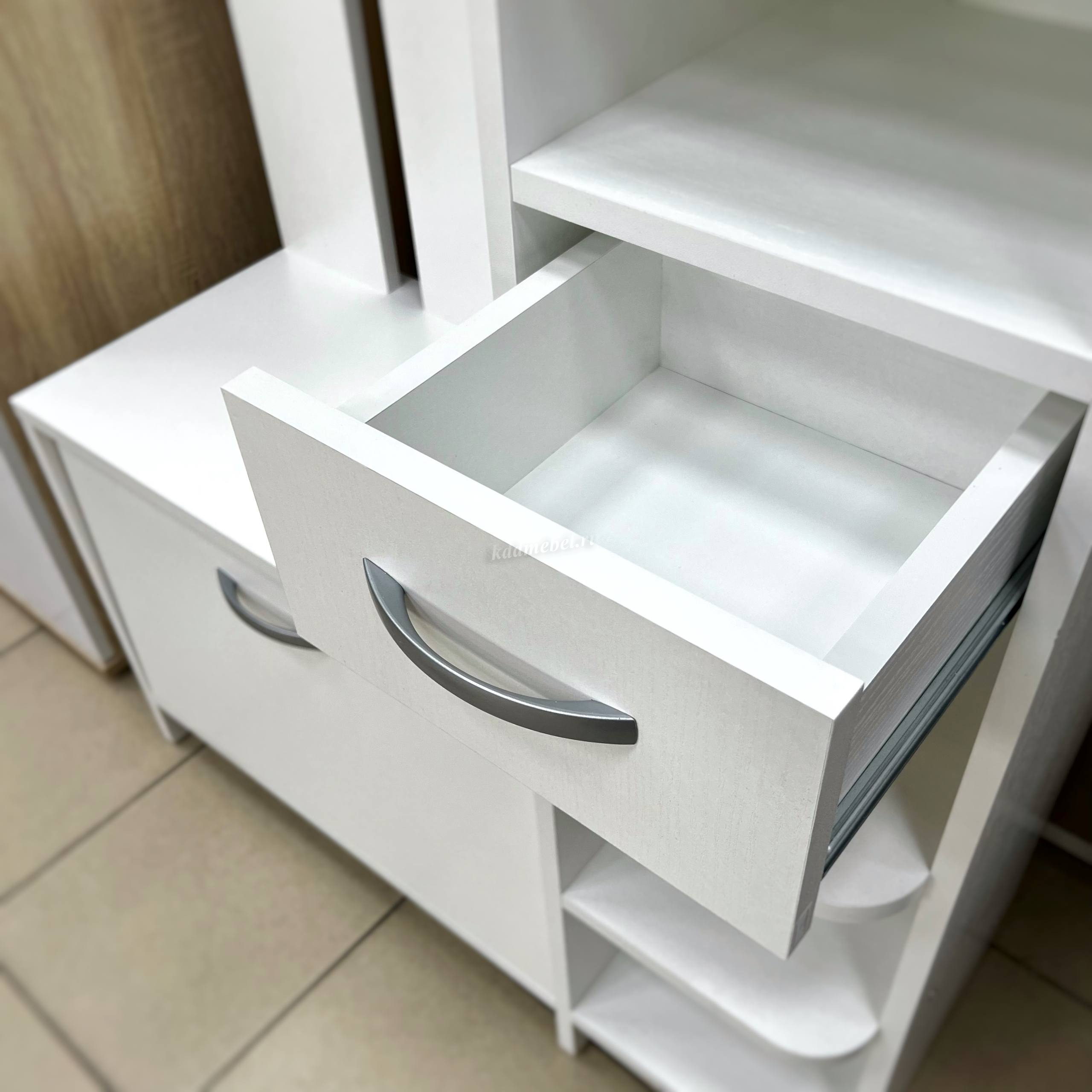 «Мила» создана для Вашей прихожей – Вы можете повесить одежду и сумку на металлические крючки, шляпки положить на полку сверху, нужные мелочи – в выдвижной ящик. На открытых полках можно разместить зонты, перчатки и шарфы. Есть зеркало и обувница.