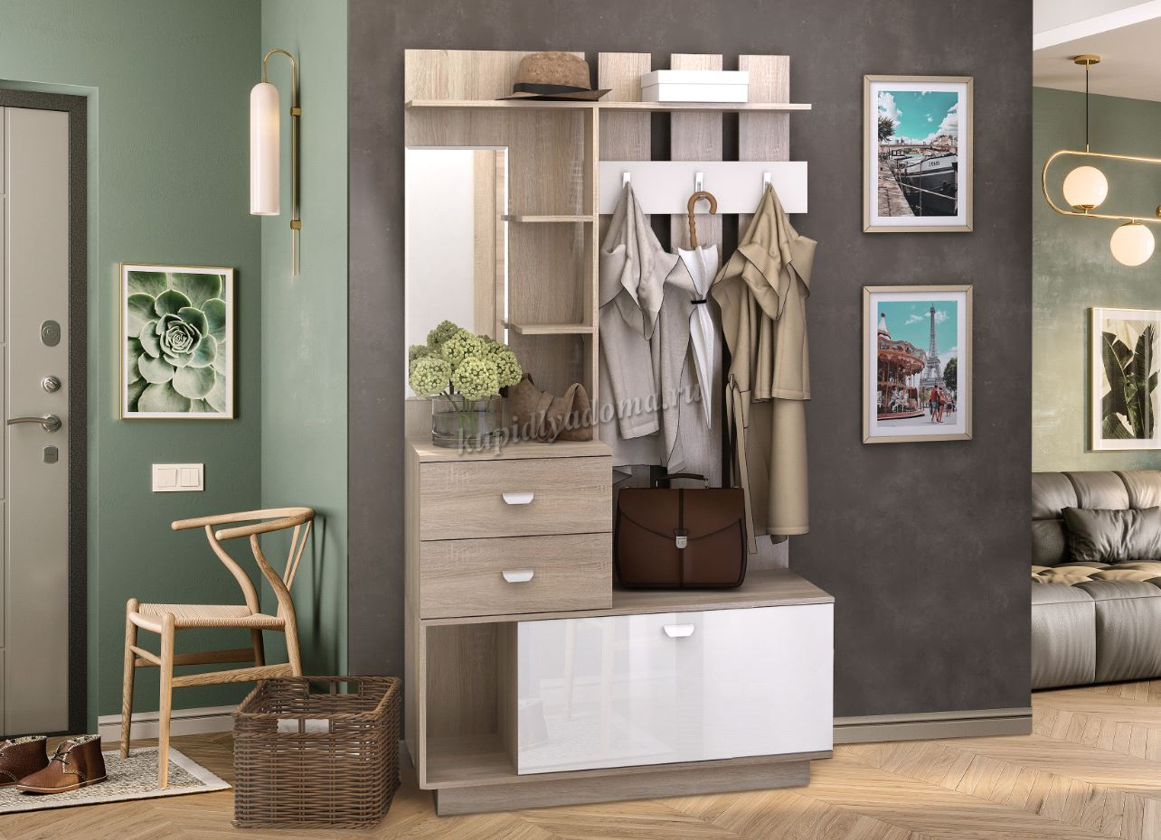 Эффективное решение для небольшой прихожей — это «Вега ». Несмотря на компактные размеры, мебель включает в себя всё необходимое для аккуратного хранения одежды и повседневных мелочей. Прихожая оснащена вместительным отсеком для обуви, ящиками, а также полками для аккуратного хранения повседневных мелочей и головных уборов.