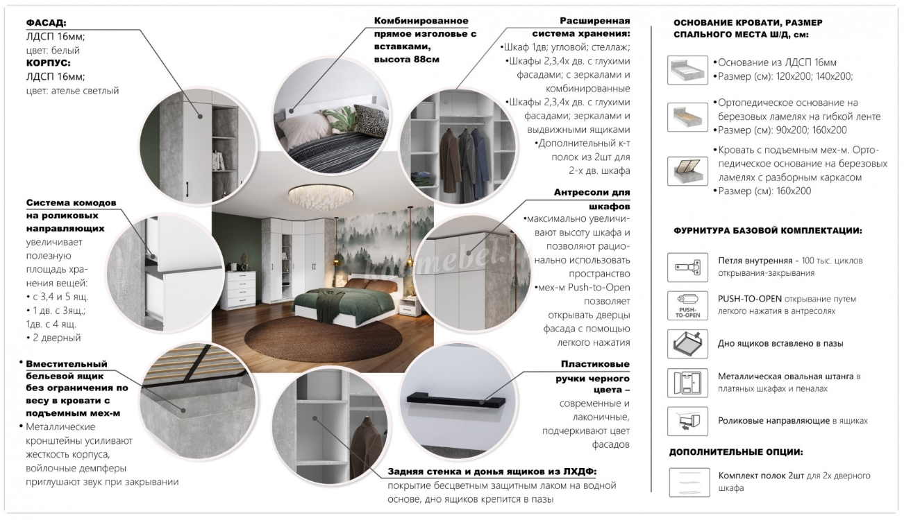 "Чикаго" - это сочетание минималистичного дизайна, комфорта и функциональности. Выигрышные комбинации свежих нейтральных оттенков создают воздушную атмосферу и позволяют легко менять интерьер. Множество модулей в едином стиле создают систему хранения и освобождают пространство.
