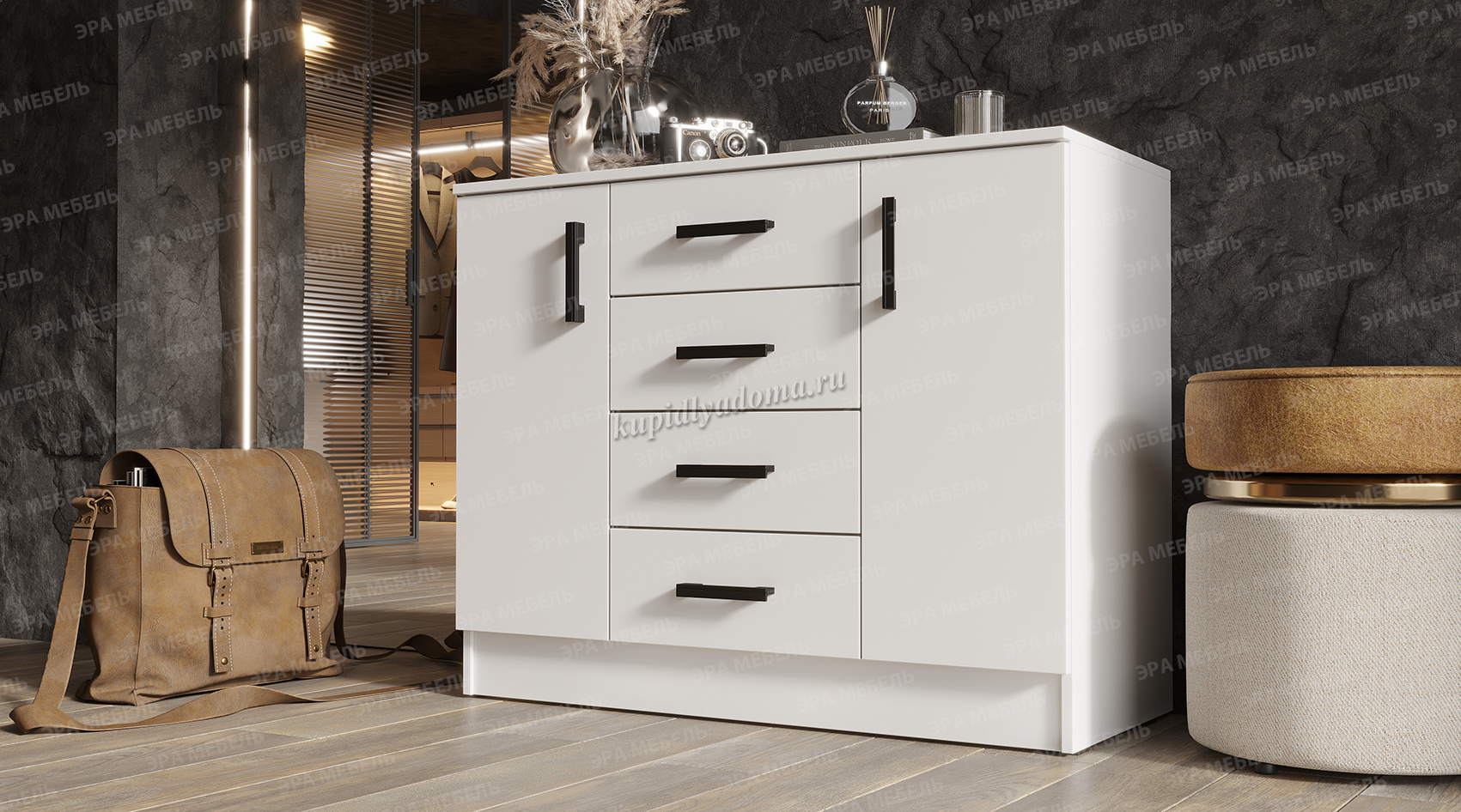 Имеет четыре выдвижных ящика и вместительные ниши за распашными дверцами.