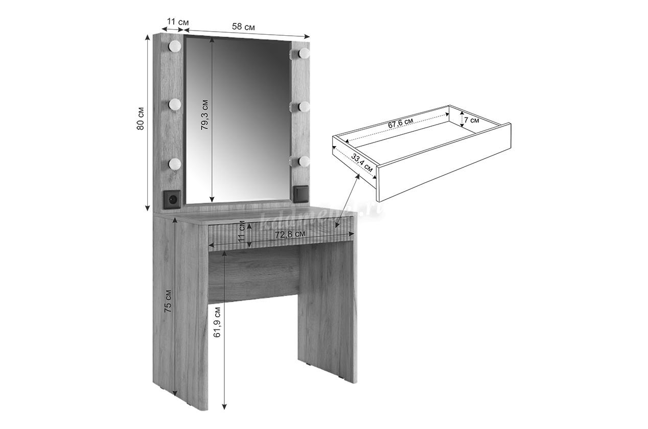 Трюмо Адам — это идеальное сочетание стиля и практичности. С широким фацетированным зеркалом, в котором встроена подсветка из 6 лампочек, оно создает атмосферу профессиональных студий визажистов прямо у вас дома. Комфорт и функциональность обеспечиваются дополнительными элементами, такими как выключатель, розетка для фена и выдвижной ящик для хранения украшений и косметики. Элегантные закругленные углы завершают дизайн, делая его идеальным дополнением к вашей спальне.