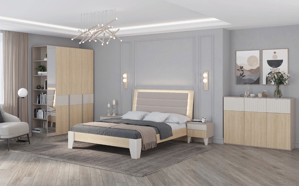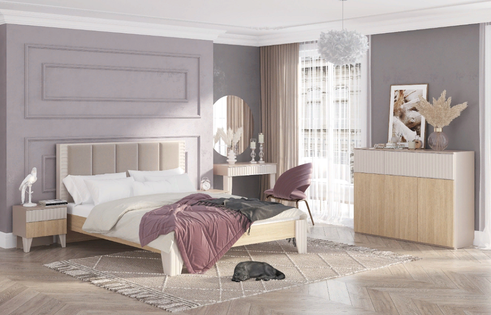 Эксклюзивная коллекция для спальни «Беатрис» выполнена в цвете Палермо с тиснением натурального матового дерева и украшена вставками из МДФ в цвете Латте с матовой приятной текстурой. Теплые расцветки золотисто-коричневого цвета создают уютную атмосферу. Комплект мебели для спальни оформлен по всем правилам современного стиля, и не пестрит деталями, ведь главное в спальне – лаконичность, законченность и продуманность.