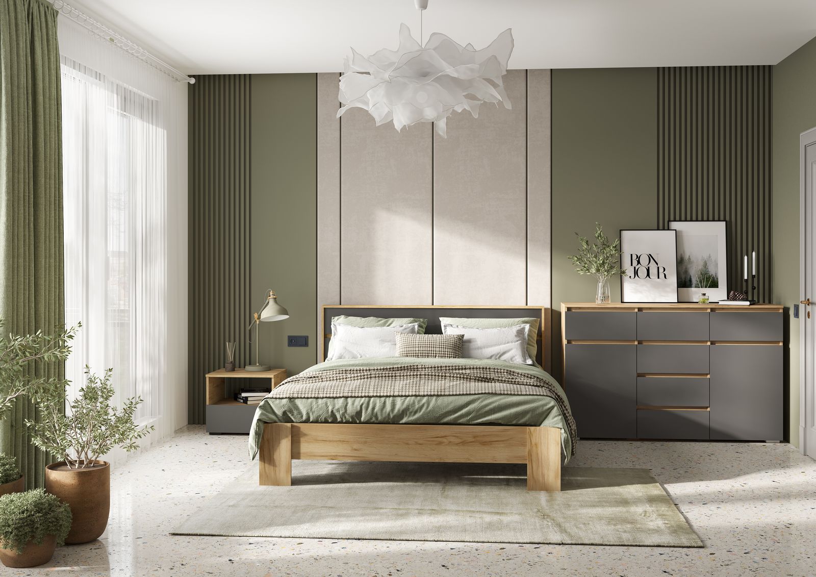 Спальный гарнитур Хелен — элегантное и функциональное решение для вашей спальни, которое сочетает практичность и комфорт. В наборе есть всё необходимое для создания уютной обстановки. Минималистичный дизайн фасадов без лицевой фурнитуры и декоративных элементов отлично сочетается с современными интерьерами