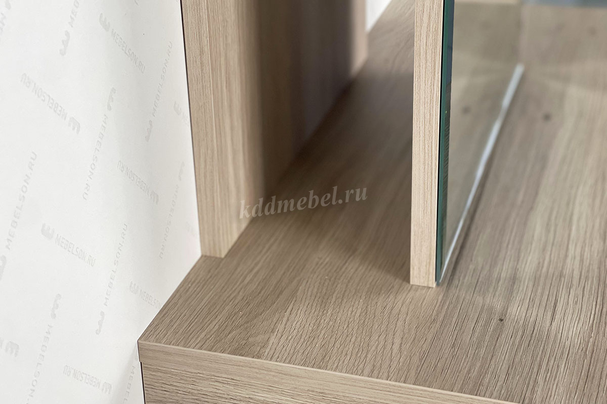 Сборка у трюмо универсальная. Зеркальную панель с полками можно установить ближе к левому либо ближе к правому краю. Так же полки за панелью крепятся в разных положениях.