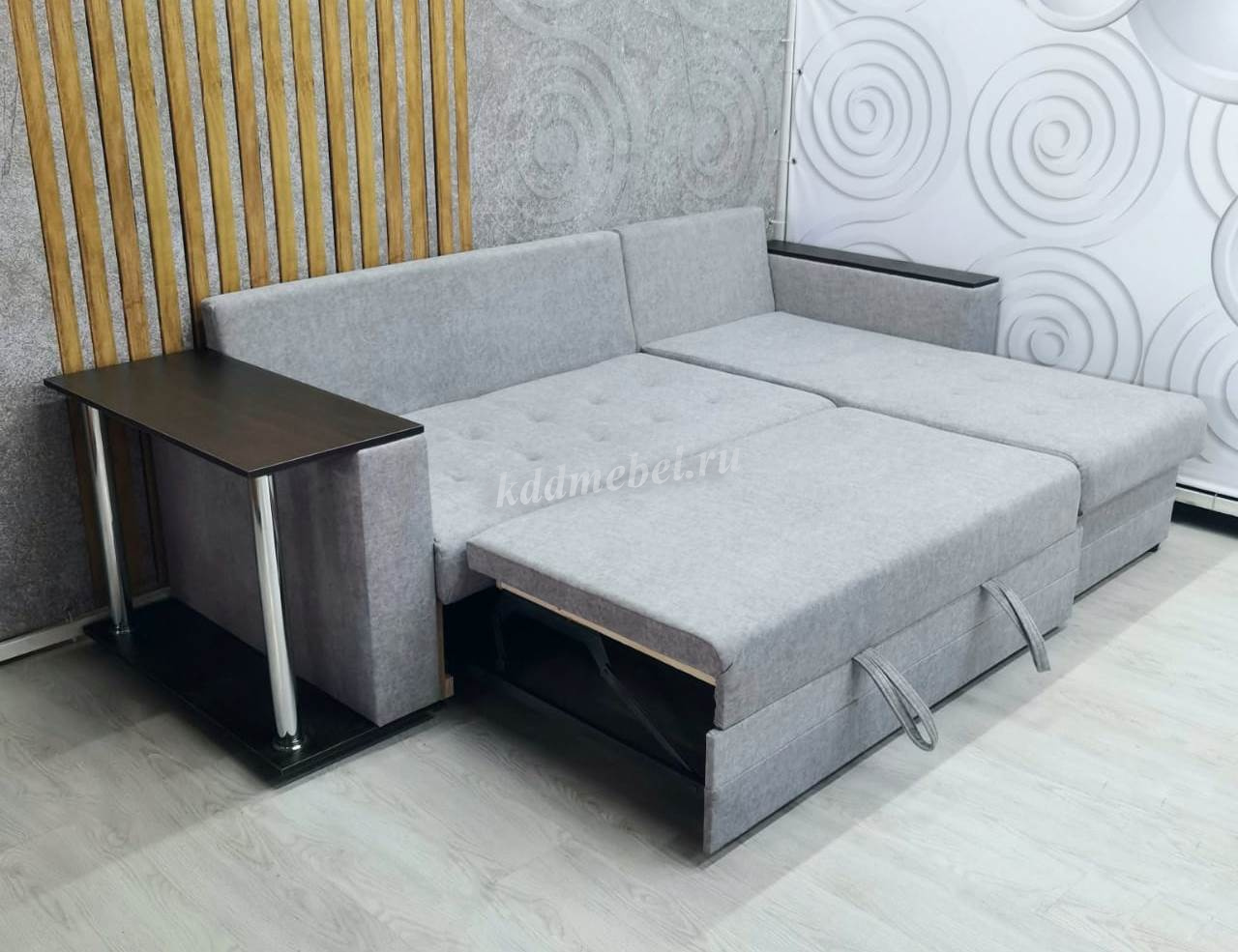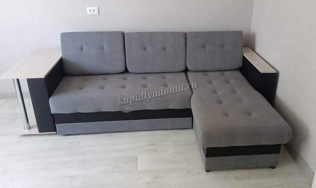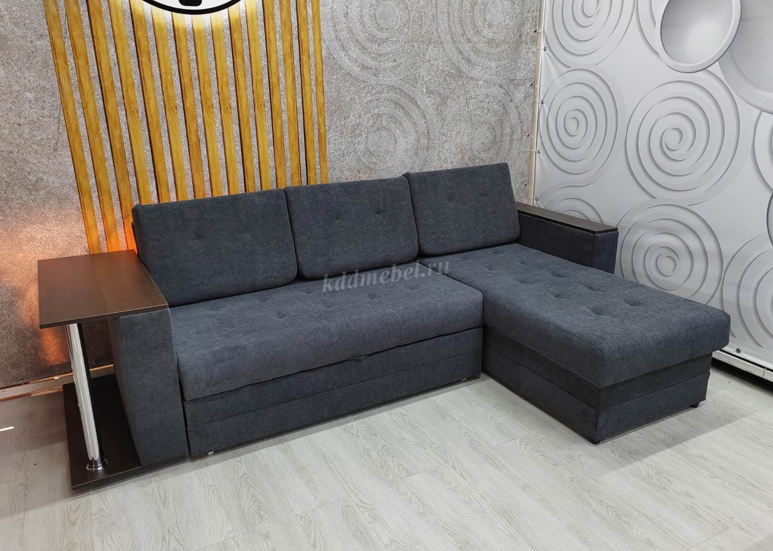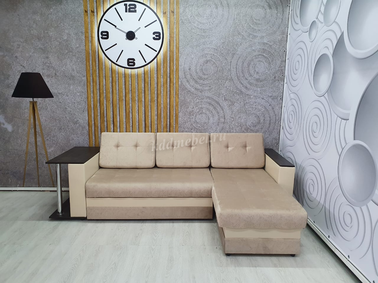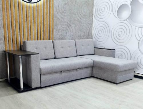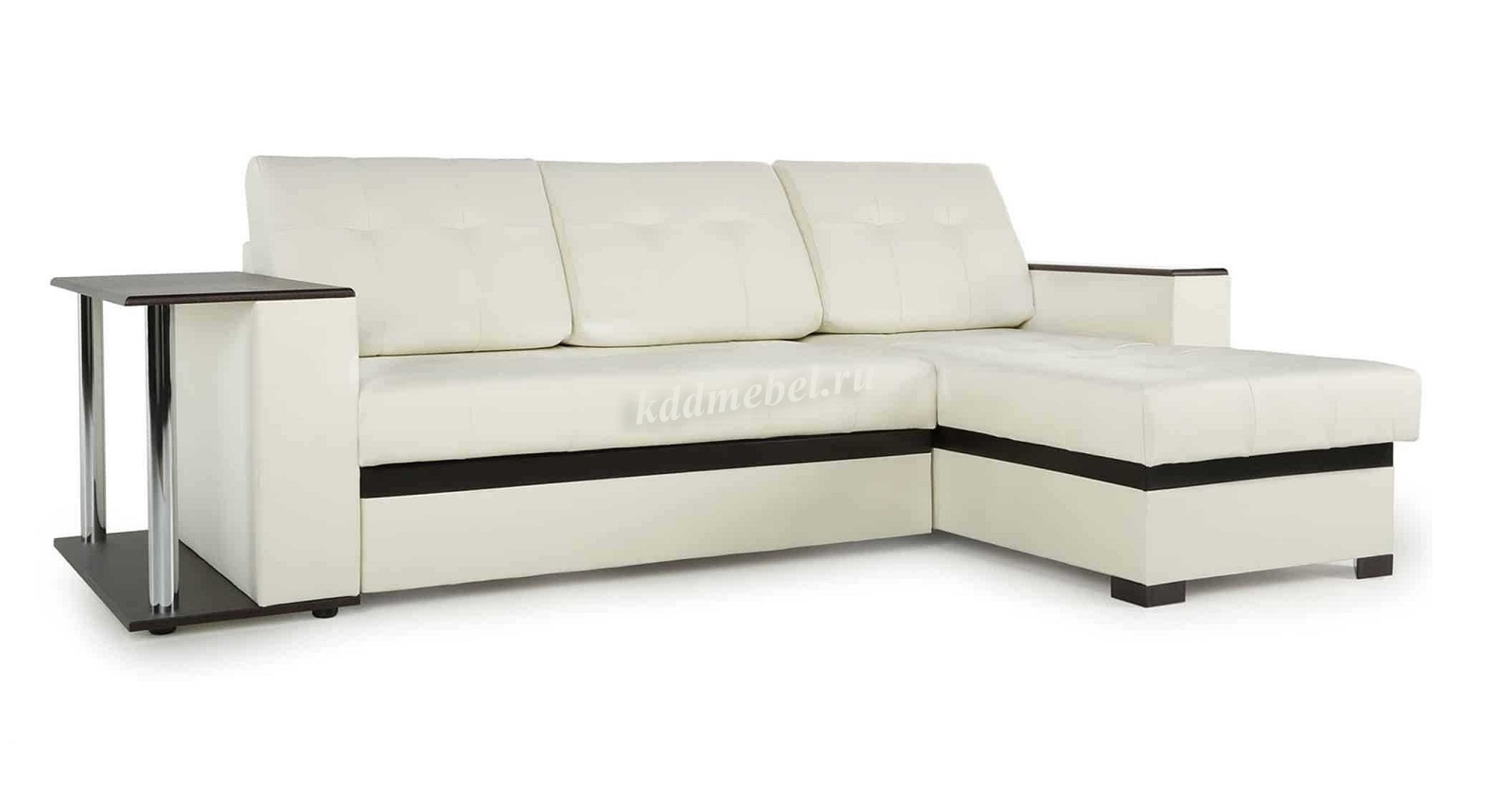 Угловой диван Атланта – яркий пример удачного сочетания элегантного стиля и функциональности. Характерная особенность модели – встроенный журнальный столик для особенно комфортного отдыха и элегантное сочетание рогожки и экокожи разных оттенков. Комплексный наполнитель способствует равномерному распределению веса во время эксплуатации. Диван оборудован вместительным ящиком для хранения белья и легко трансформируется в полноценное спальное место.