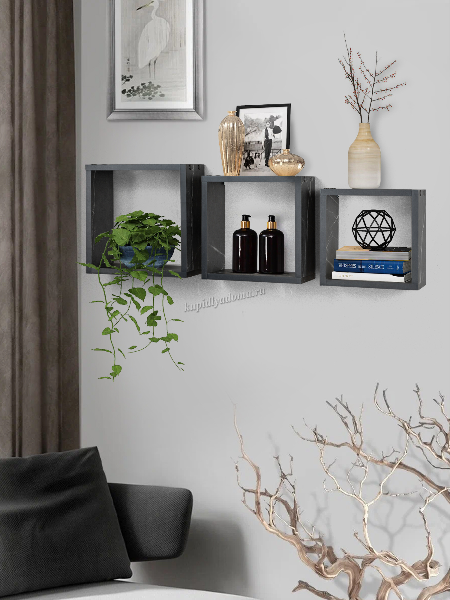 Модель состоит из трех полок: размер 300х130х300 мм, 270х270х130 мм ,240х130х240 мм и выполнена в цвете камень пьетра.