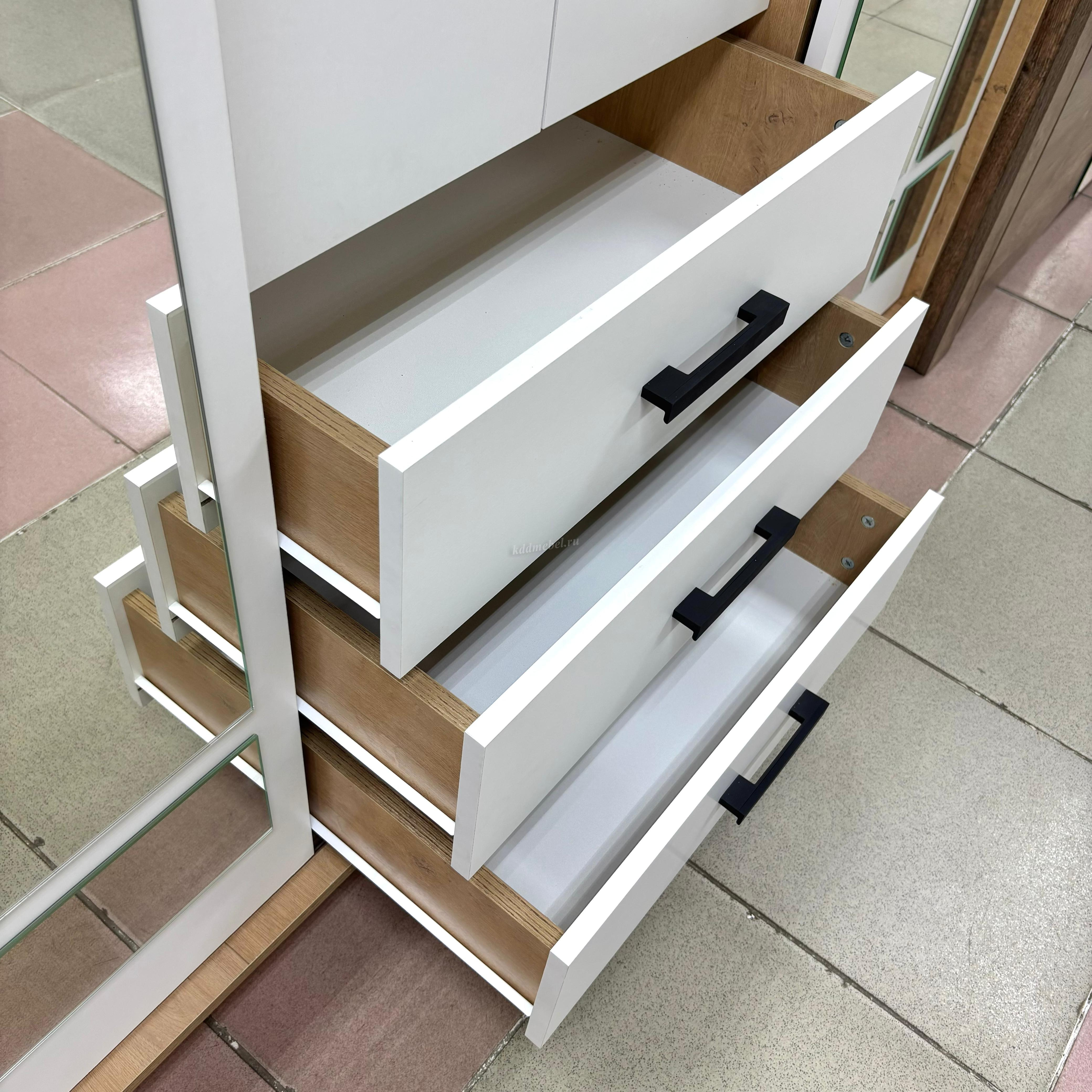 Удобный и вместительный шкаф-купе ЛОРД благодаря необычному дизайну хорошо подойдет интерьеру в любом стиле. Изюминкой шкафа являются оригинальные зеркальные фасады. Шкаф отлично будет смотреться в спальне или прихожей, добавляя помещению света. Два боковых отделения шкафа предназначены для хранения одежды и комплектуются антресольной полкой и 3 штангами. Центральное отделение в нижней части оборудовано тремя вместительными ящиками, верхняя часть с распашными дверцами комплектуется полками.