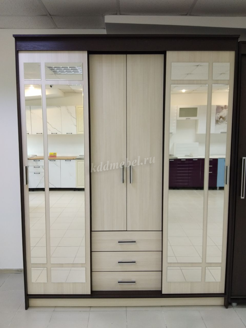 Удобный и вместительный шкаф-купе ЛОРД благодаря необычному дизайну хорошо подойдет интерьеру в любом стиле. Изюминкой шкафа являются оригинальные зеркальные фасады. Шкаф отлично будет смотреться в спальне или прихожей, добавляя помещению света. Два боковых отделения шкафа предназначены для хранения одежды и комплектуются антресольной полкой и 3 штангами. Центральное отделение в нижней части оборудовано тремя вместительными ящиками, верхняя часть с распашными дверцами комплектуется полками.
