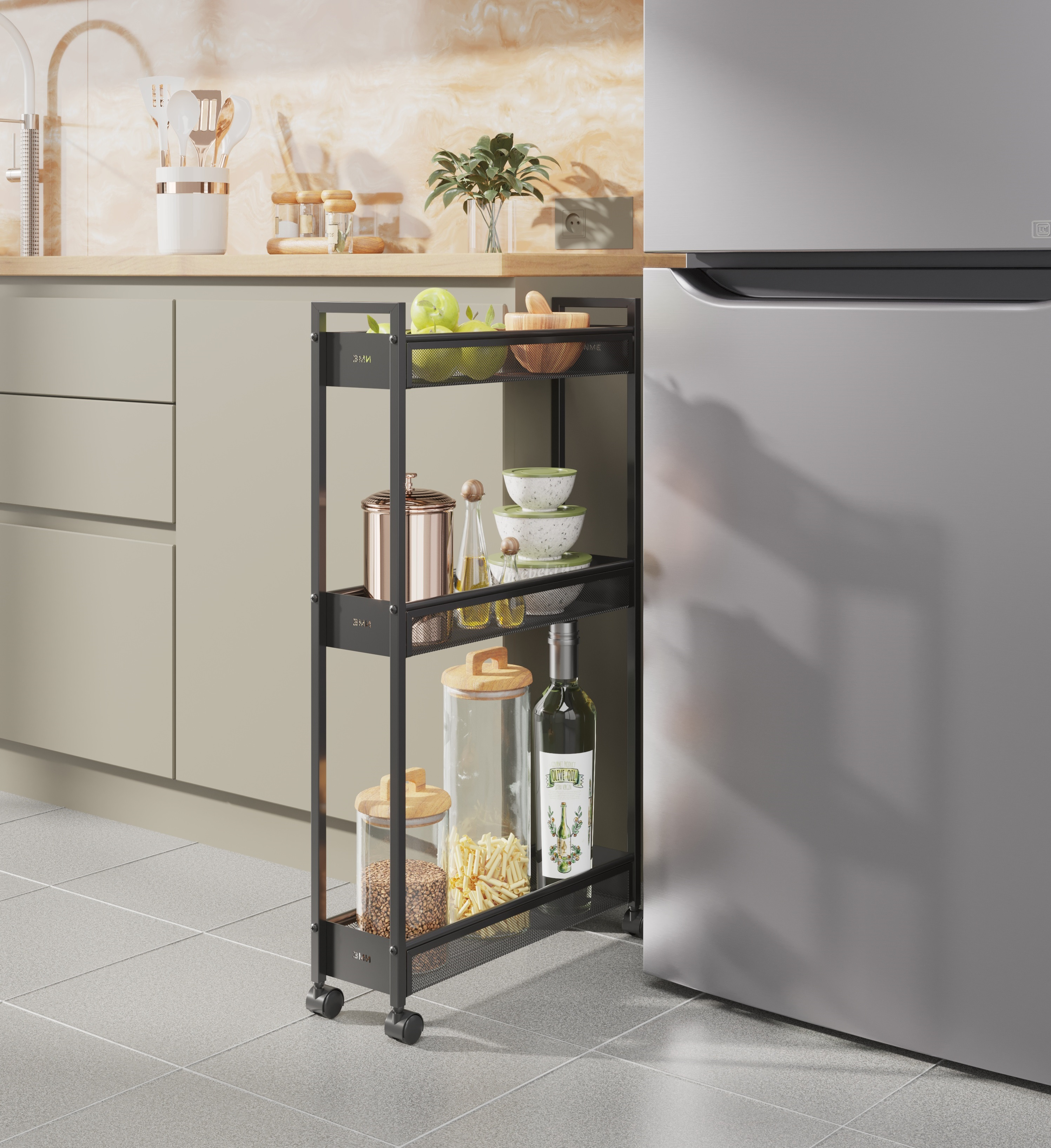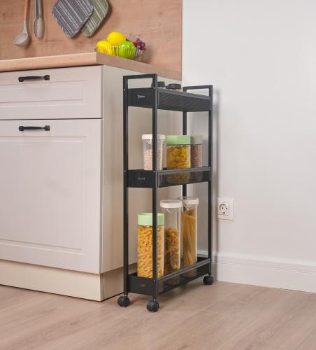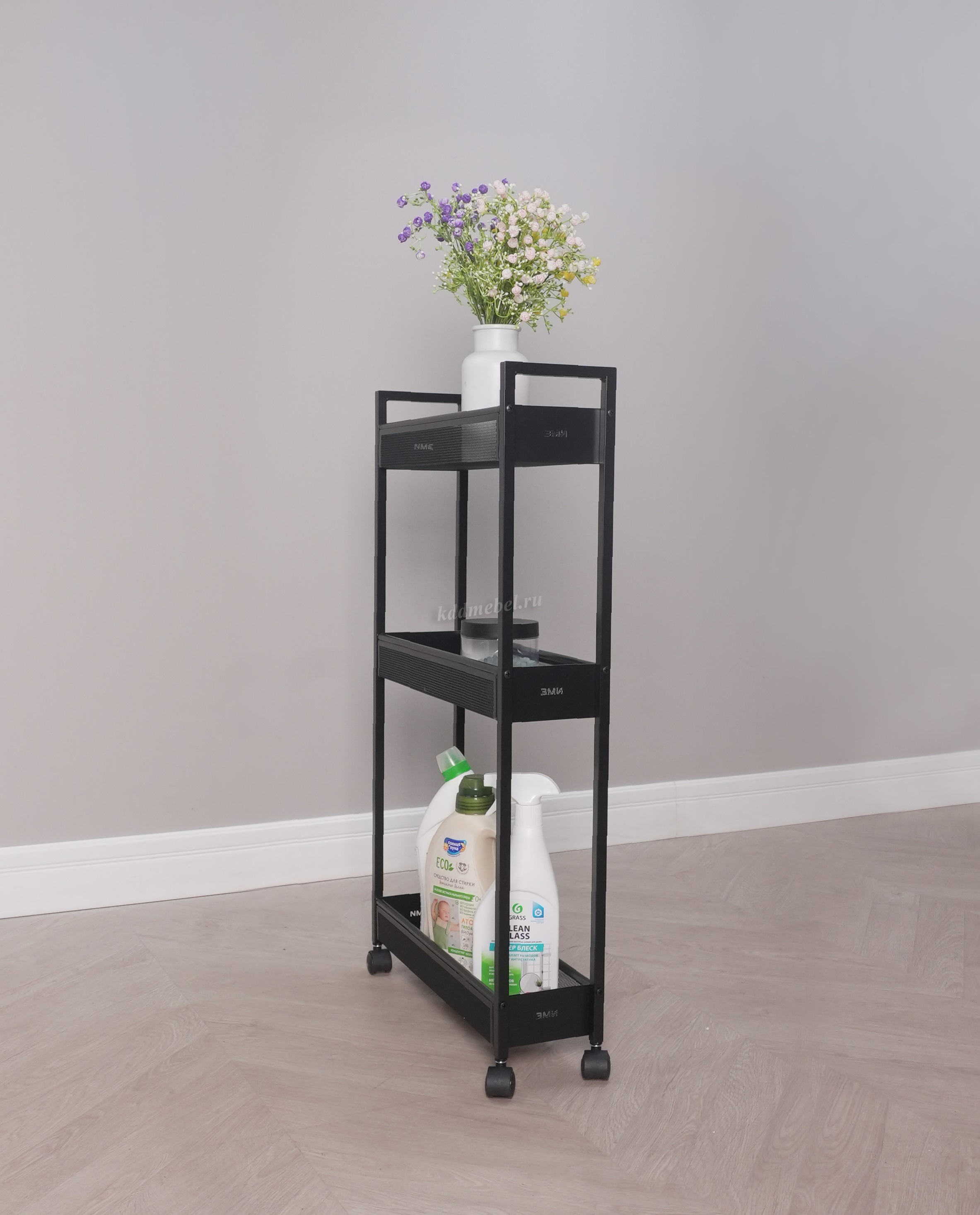 Эта лёгкая, но прочная этажерка с вместительными корзинами и мобильными колесиками (360°) легко перемещается и вписывается в любой интерьер.